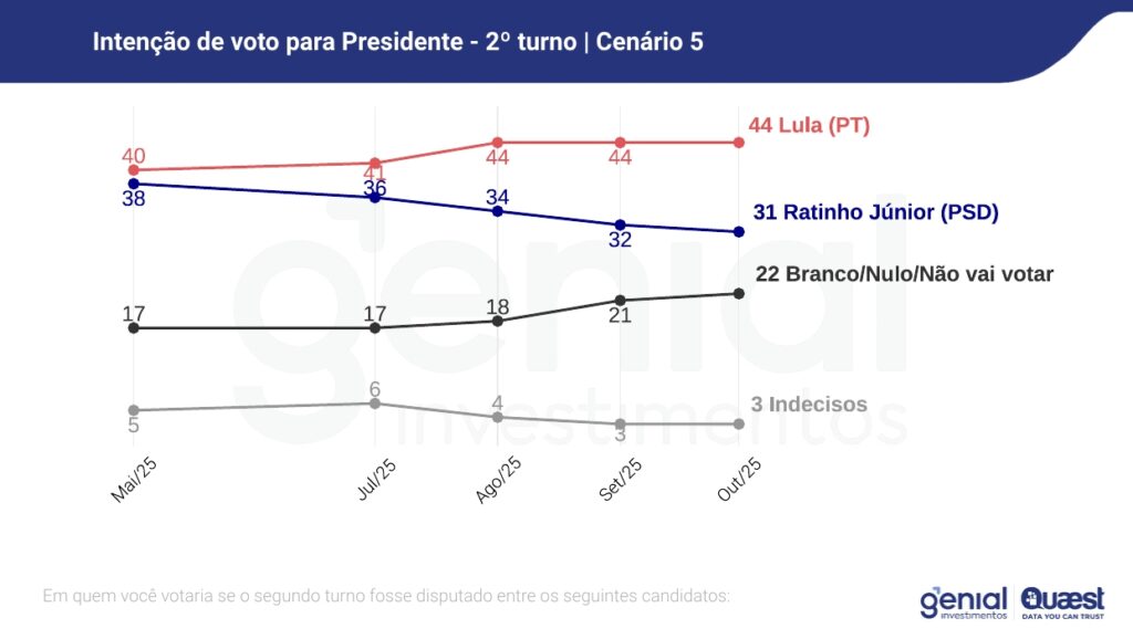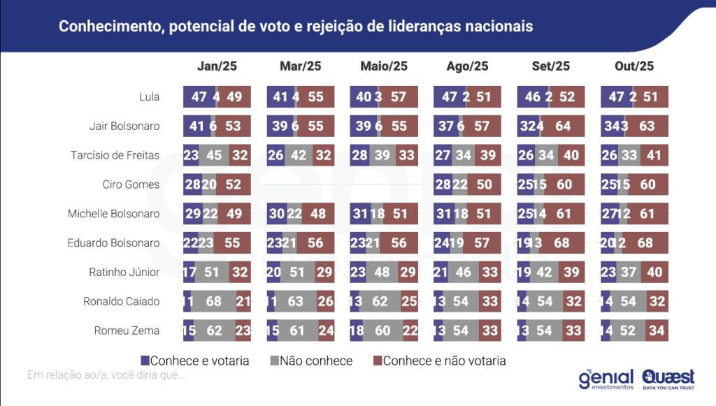 As entrevistas para a pesquisa Quaest de outubro foram feitas presencialmente com 2.004 eleitores, de 2 a 5 de outubro. A margem de erro é de dois pontos percentuais, para mais ou para menos, em um nível de confiança de 95%.