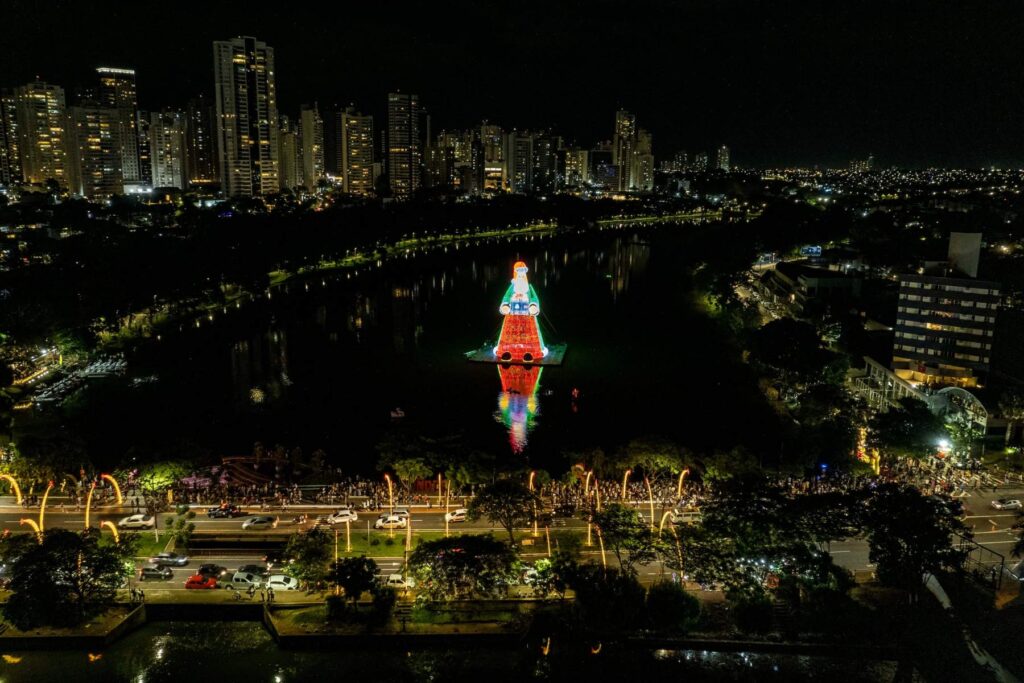 A Prefeitura de Londrina ligou pela primeira vez, neste domingo (30), a iluminação do Papai Noel gigante de 27 metros de altura no Lago Igapó. Com cerca de 450 mil lâmpadas de LED decorativas e pesando 15 toneladas, a figura será avaliada por uma comissão julgadora do Guinness World, o livro dos recordes, que estará presente no local na sexta-feira (5) para reconhecê-lo como o maior do mundo.