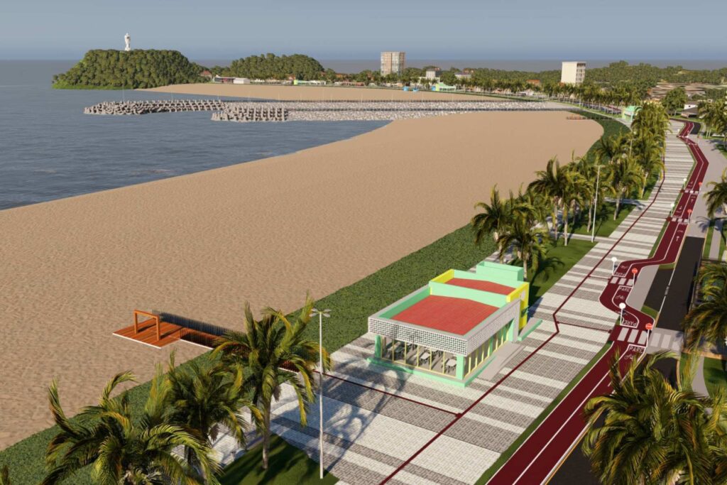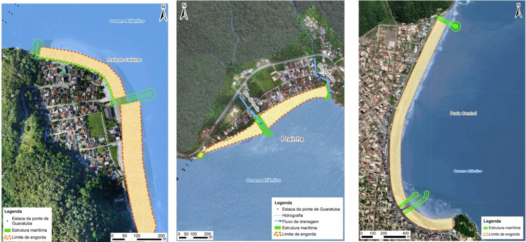 O projeto prevê, ao todo, nove estruturas marítimas voltadas para a mitigação e controle de processos erosivos ao longo da orla, para aumentar a capacidade de vazão de água da chuva para o mar e melhorar a balneabilidade das praias. São cinco guias de corrente (dois na Praia Central e três na Prainha), dois espigões em Caieiras e dois headland (Praia Central e Prainha), com a implantação de 15.563 tetrápodes.