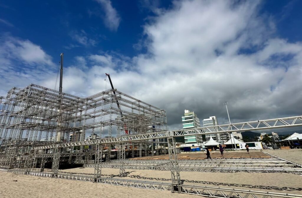 O palco nas areias de Matinhos começou a ser montado no dia 17 de dezembro e já nesta segunda-feira (22) é possível ver o esqueleto tomando forma, com grande parte das estruturas metálicas montadas. Serão 45 metros de largura, 21 metros de altura e 23 metros de profundidade, dimensões superiores às do palco de 2025, quando eram 39 metros de largura, 14 metros de altura e 16 metros de profundidade. A área de camarotes também começou a ganhar forma.