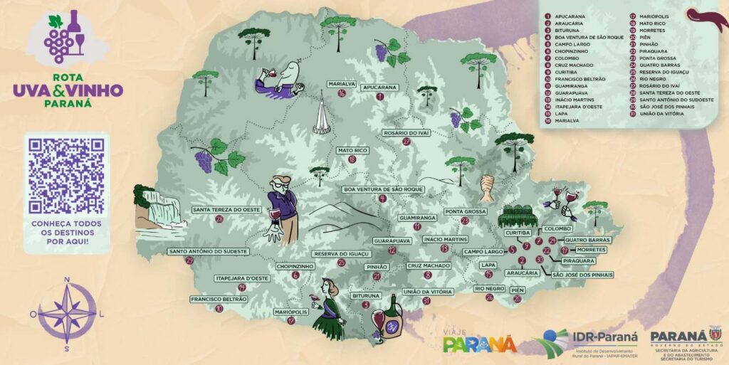 Com 30 municípios da Região Metropolinata de Curitiba, Oeste e Sudoeste, o Paraná ganhou oficialmente a Rota Uva & Vinho. A iniciativa é do Sistema Estadual de Agricultura (Seagri), coordenada pela Secretaria da Agricultura e do Abastecimento (Seab), e pretende organizar e fortalecer a vitivinicultura no turismo rural e na economia regional. O roteiro reúne propriedades, vinhedos e vinícolas em um mapa digital com sinalização temática e informações históricas e regionais voltadas ao visitante. O lançamento oficial ocorreu na noite desta terça-feira (24), no Memorial de Curitiba.