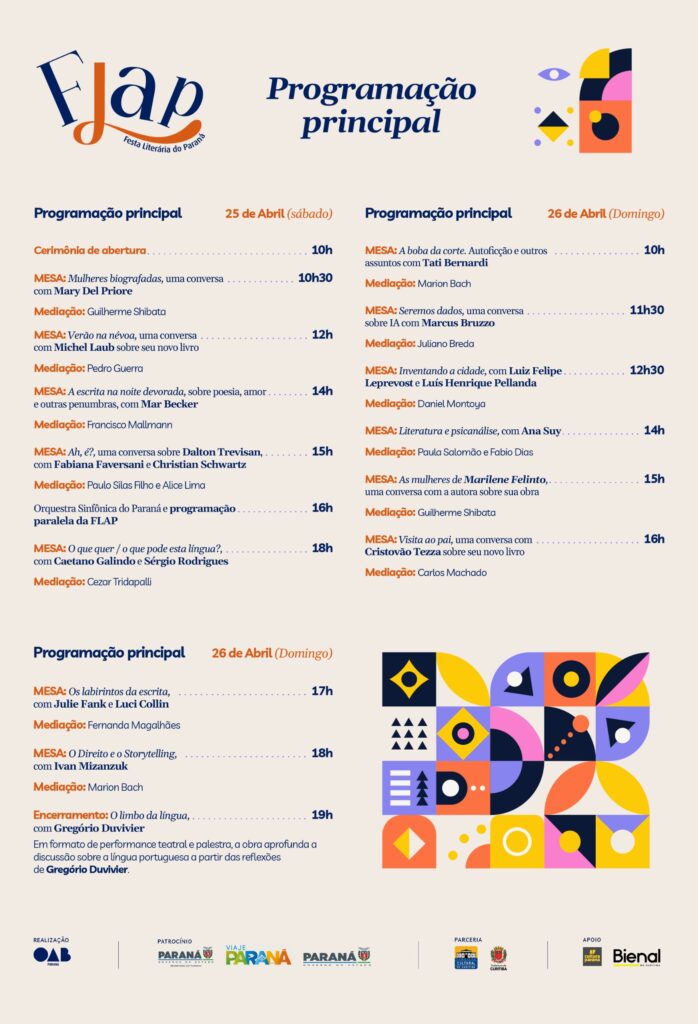 Um evento literário inédito ocupará o Museu Oscar Niemeyer neste sábado (25) e domingo (26): a Festa Literária do Paraná, iniciativa da OAB Paraná para promover o encontro entre leitores, autores e diferentes manifestações culturais. Na programação, totalmente gratuita e aberta a comunidade, nomes de peso do cenário local e nacional, como Ana Suy, Caetano Galindo, Cristóvão Tezza, Luci Collin, Mary Del Priori, Tati Bernardi e Sérgio Rodrigues. O encerramento da festa será com uma peça apresentada por Gregório Duvivier.